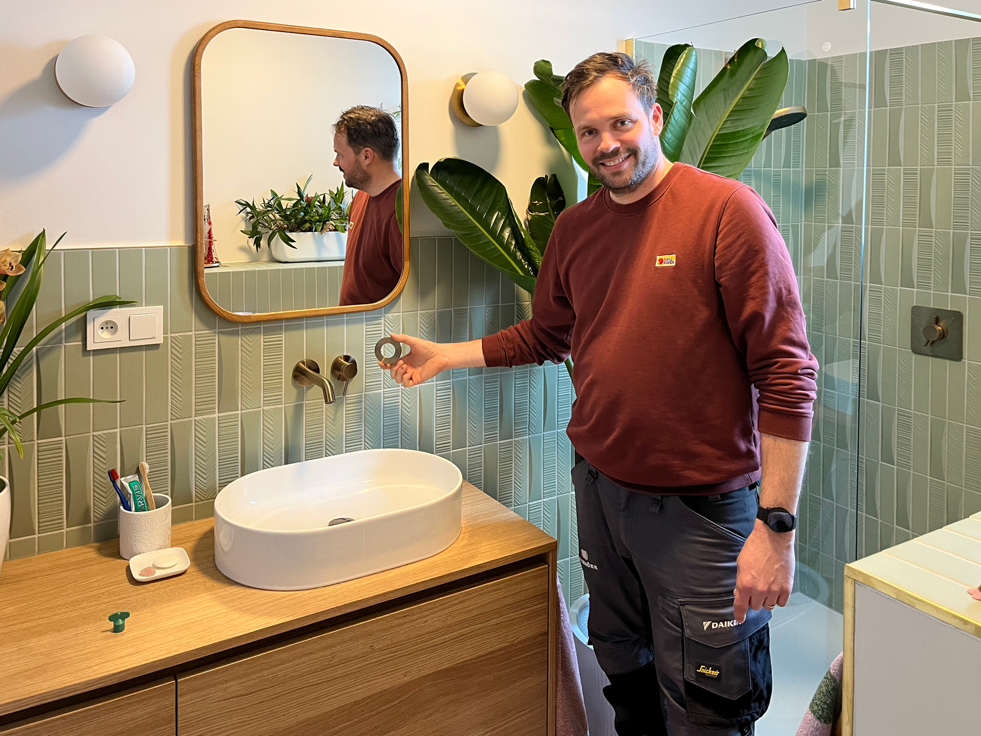 Součástí realizace bylo také kompletní ZTI včetně finální kompletace s důrazem na design a sladění detailů. Použili jsme produkty Hansgrohe v kartáčované bronzové barvě, které dodávají interiéru moderní a nadčasový vzhled.