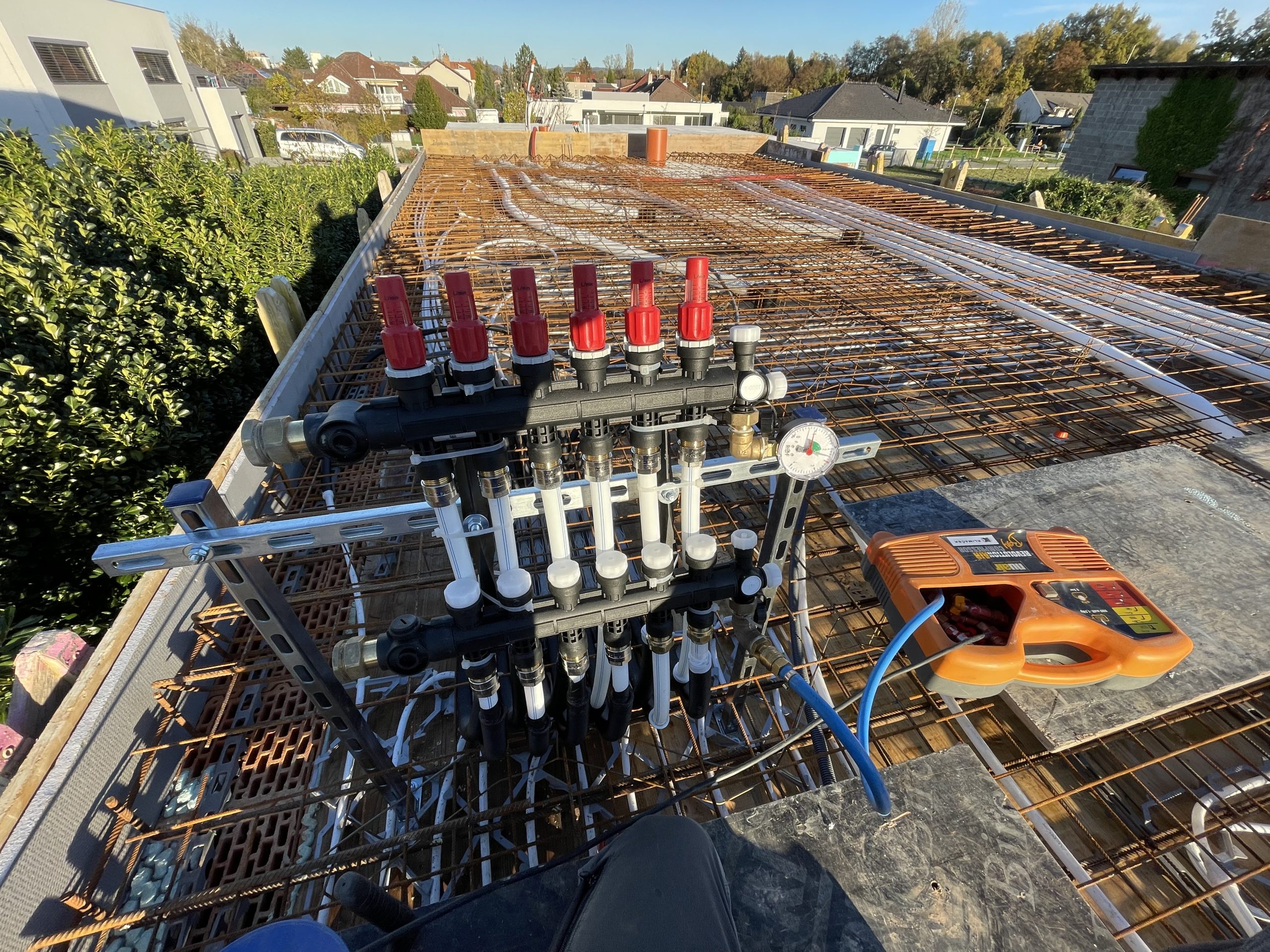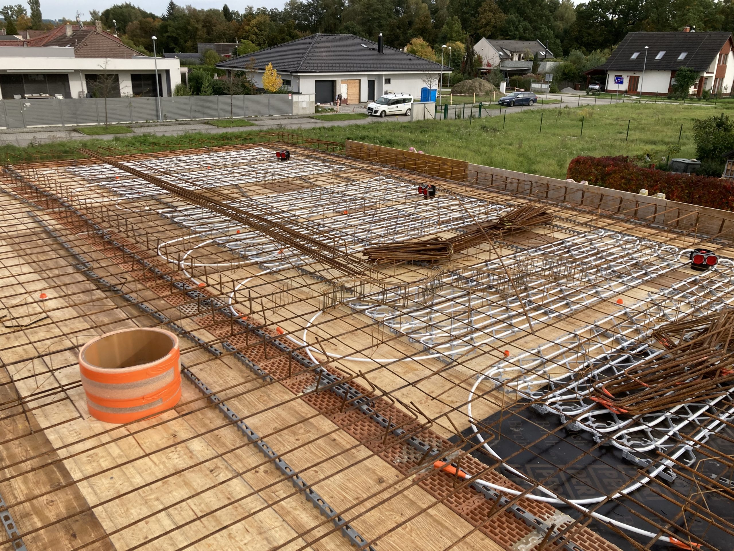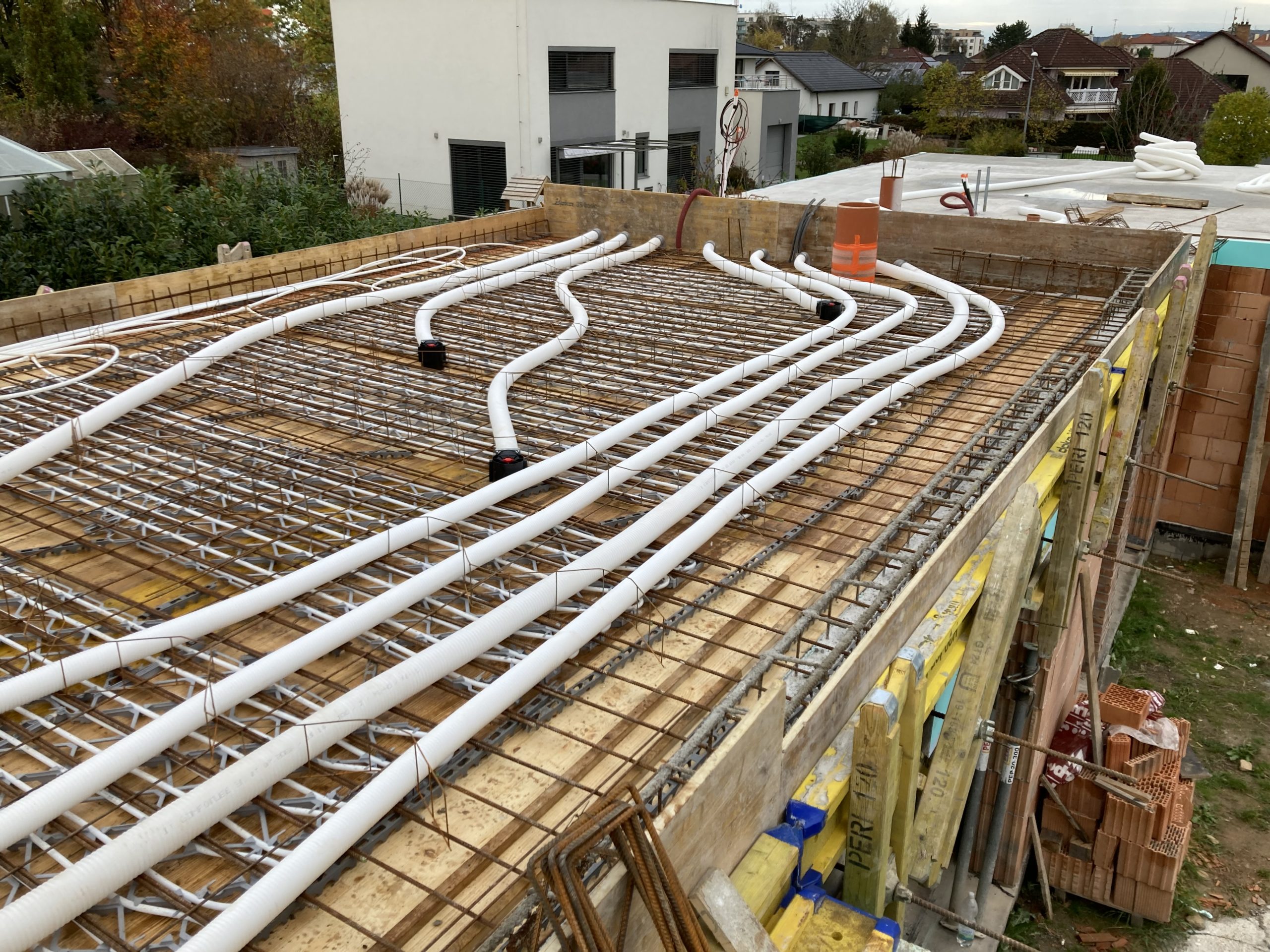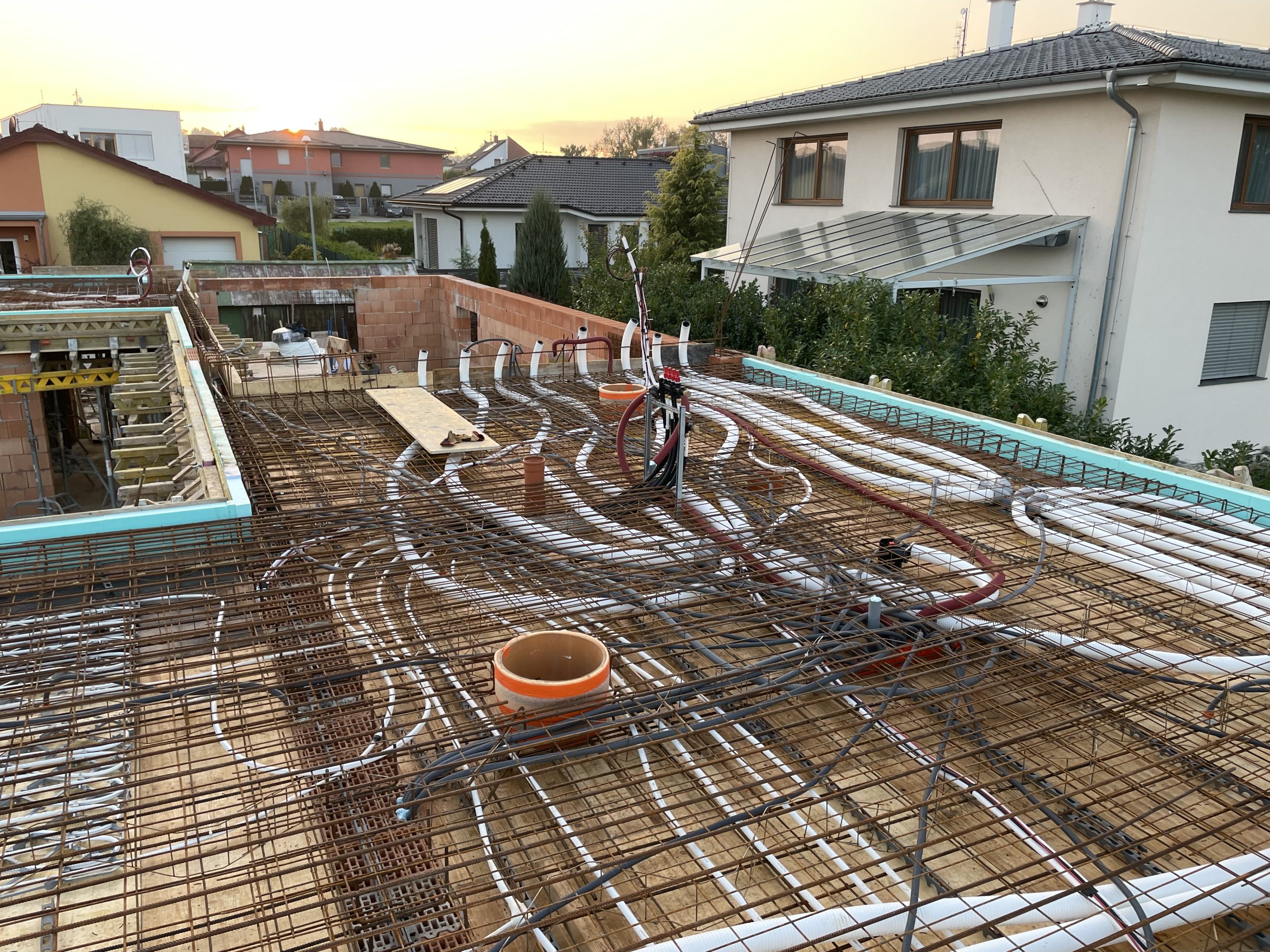 Klíčovým prvkem projektu je aktivace betonového jádra – rozvody chlazení i větrání jsou integrovány přímo do železobetonového stropu. Ve spojení s pasivním chlazením tepelného čerpadla tak dům přirozeně udržuje příjemné klima i během horkých dní, bez průvanu a bez výrazného navýšení nákladů.